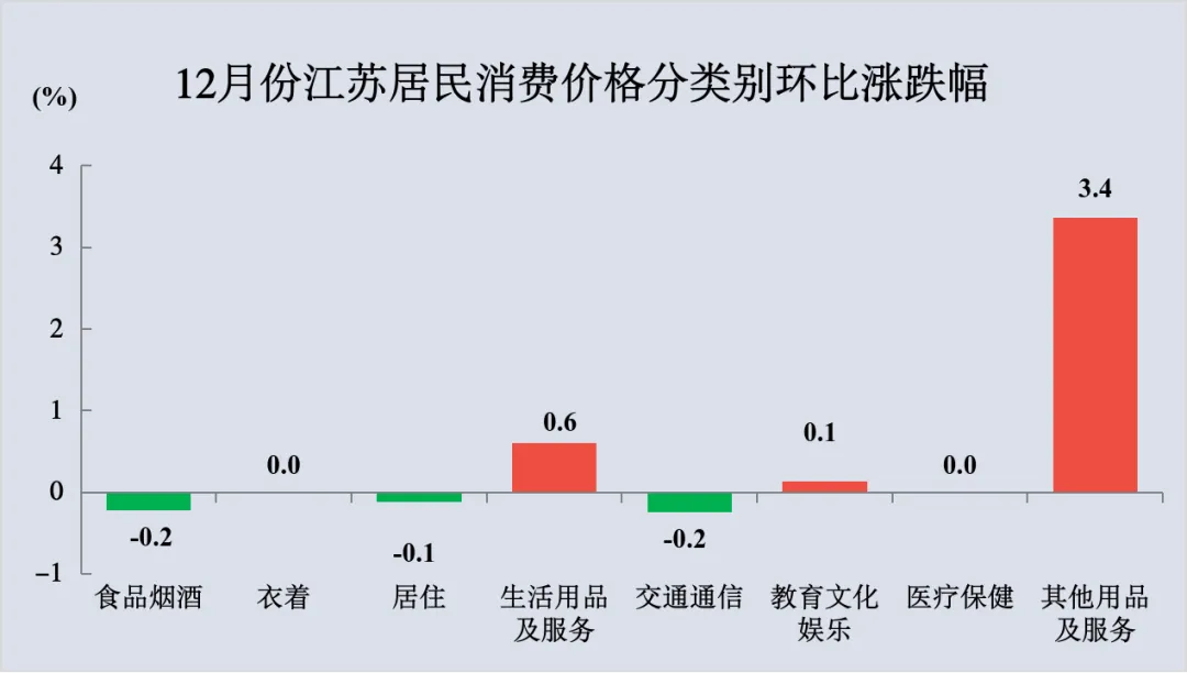 12月份,八大类商品及服务价格环比“三涨三降二平”。其中,生活用品及服务价格上涨0.6%,教育文化娱乐价格上涨0.1%,其他用品及服务价格上涨3.4%;食品烟酒价格下降0.2%,居住价格下降0.1%,交通通信价格下降0.2%;衣着、医疗保健价格均持平。