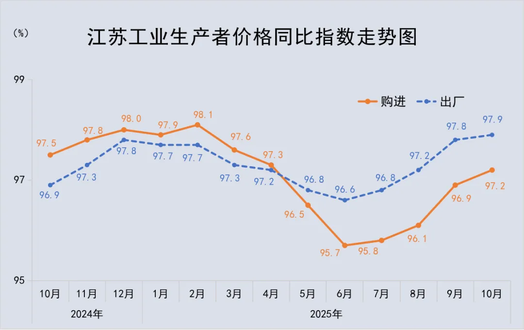 2025年10月份江苏工业生产者出厂价格同比下降2.1%
