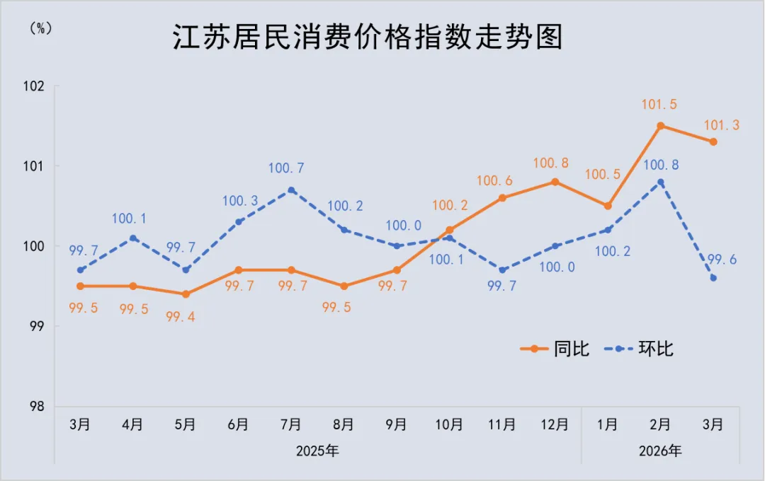 2026年3月份江苏居民消费价格同比上涨1.3%