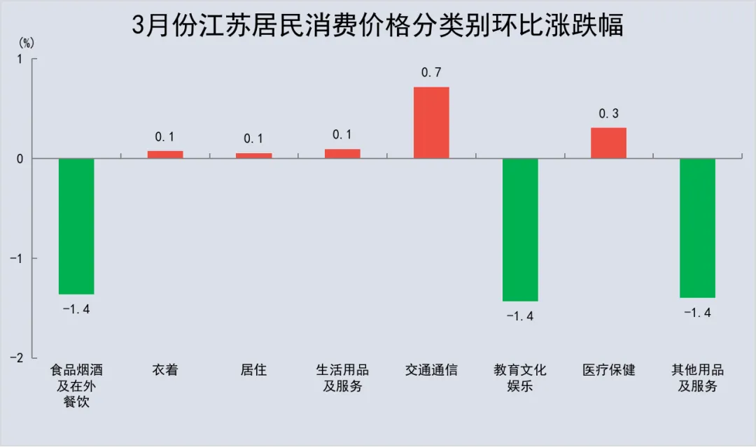 3月份,八大类商品及服务价格环比“五涨三降”。其中,衣着价格上涨0.1%,居住价格上涨0.1%,生活用品及服务价格上涨0.1%,交通通信价格上涨0.7%,医疗保健价格上涨0.3%;食品烟酒及在外餐饮价格下降1.4%,教育文化娱乐价格下降1.4%,其他用品及服务价格下降1.4%。