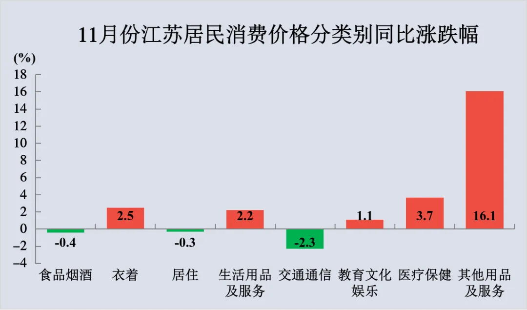 11月份,八大类商品及服务价格同比“五涨三降”。其中,衣着价格上涨2.5%,生活用品及服务价格上涨2.2%,教育文化娱乐价格上涨1.1%,医疗保健价格上涨3.7%,其他用品及服务价格上涨16.1%;食品烟酒价格下降0.4%,居住价格下降0.3%,交通通信价格下降2.3%。