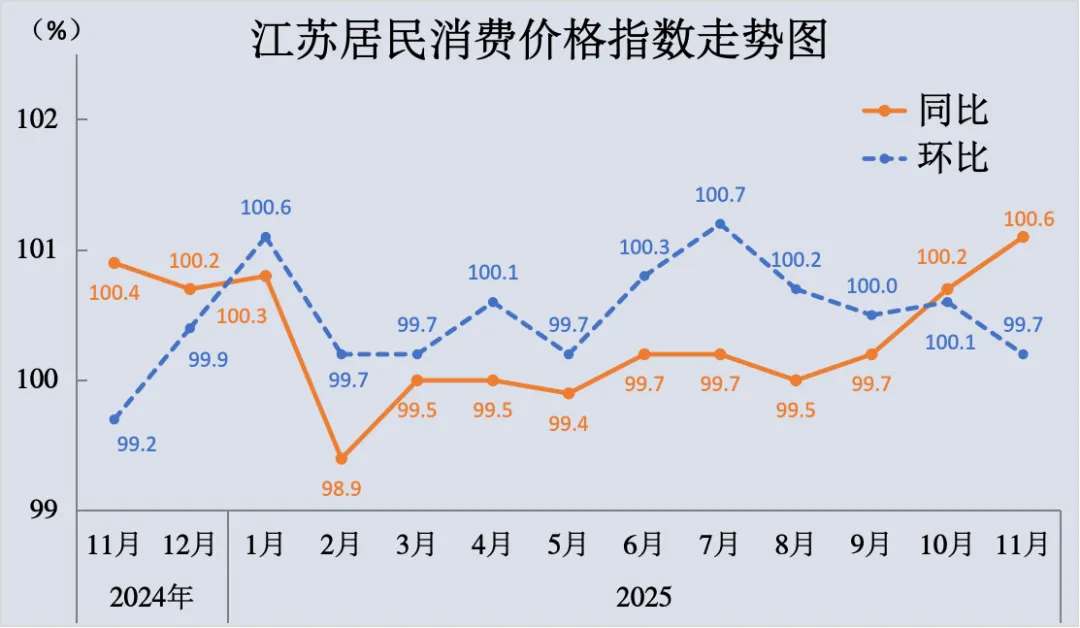 2025年11月份江苏居民消费价格同比上涨0.6%